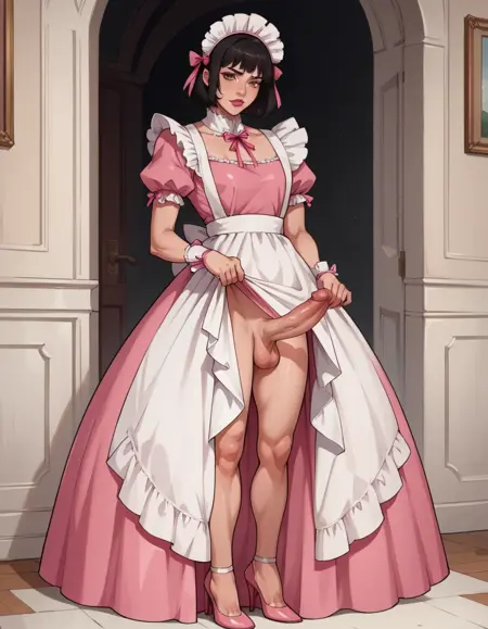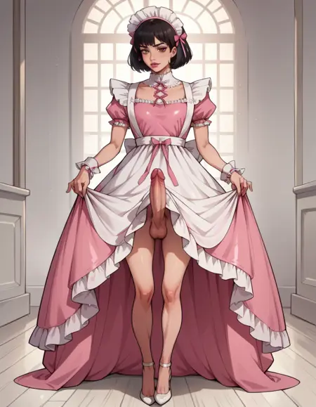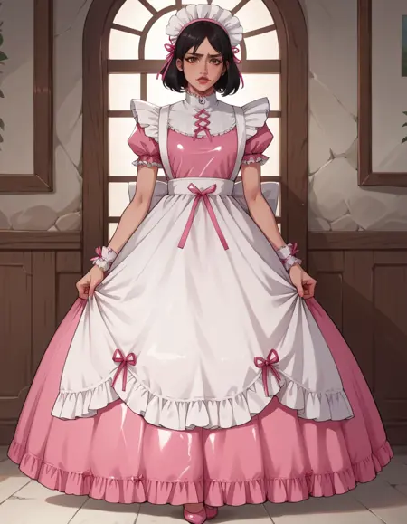 HUD_latx_gwn, puffy sleeves, pink dress, white apron, maid, latex, headdress, high heels, pink bows