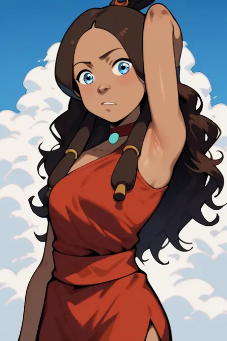 katara, 1girl, dark skin, brown hair, blue eyes, long hair, hair tubes, hair bun, armlet, red dress, single bare shoulder
