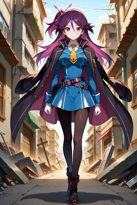 ファイアモスブルーユニフォーム: 青コート、白インナー、黄色ネクタイ、黒ジャケット、肩にかけたジャケット、黒パンツストッキング、マゼンタベルト、黒靴、アンクルブーツ、ロングスリーブ、白手袋