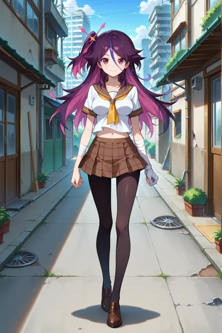 学校制服: serafuku、学校制服、腹部露出、ミニスカート、プリーツスカート、チェックスカート、黒色パンツストッキング、白シャツ、茶色スカート、茶色の靴、包帯巻きの腕、黄色いネクタイ、代替黒ジャケット、肩にかけたジャケット、包帯巻きの足、包帯巻きの首、茶色の靴