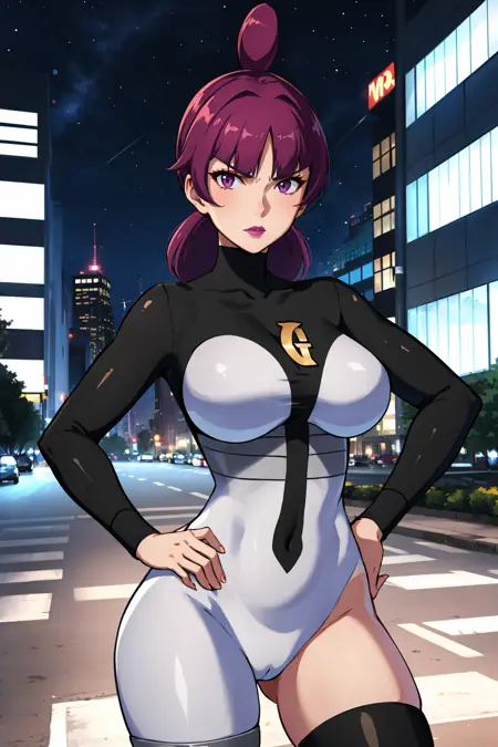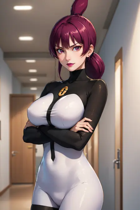 Add "purple lipstick, black sleeves, turtleneck, white bodysuit, badge, asymmetrical legwear" for her typical look.