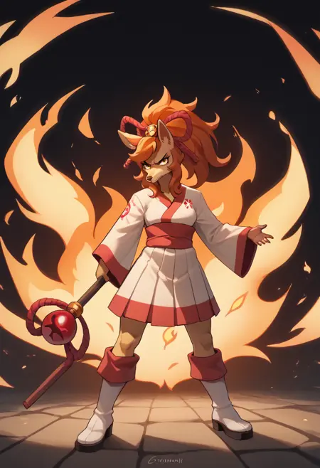 Clothing and accessories: kimono, japanese clothes, sash, white boots, staff, bell, ribbon, hair ribbon