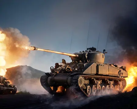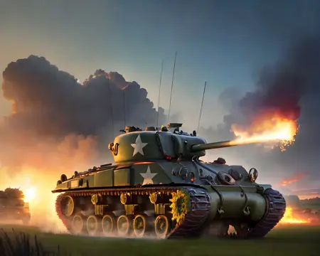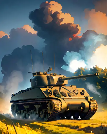 M4シャーマン戦車の画像を生成します。車両は複雑なため、100%正確ではない可能性がありますが、全体的にはインペイントや修正に十分なクオリティです。