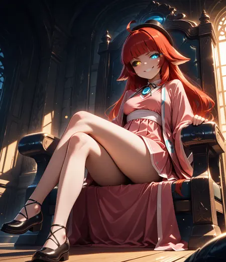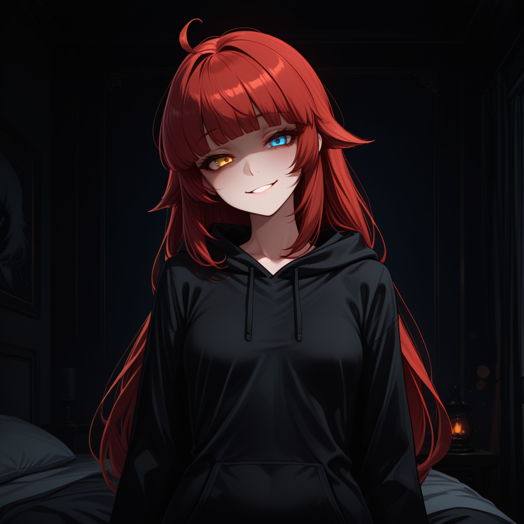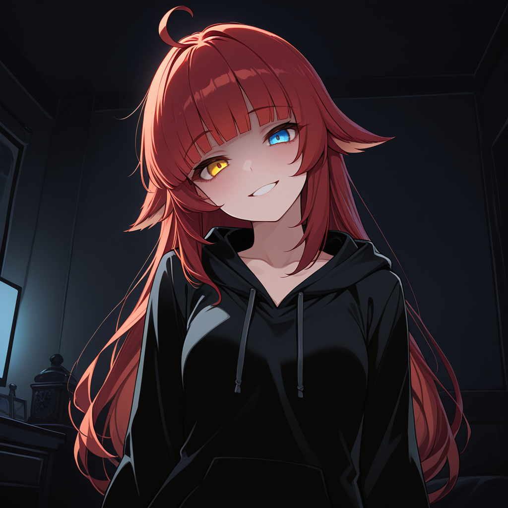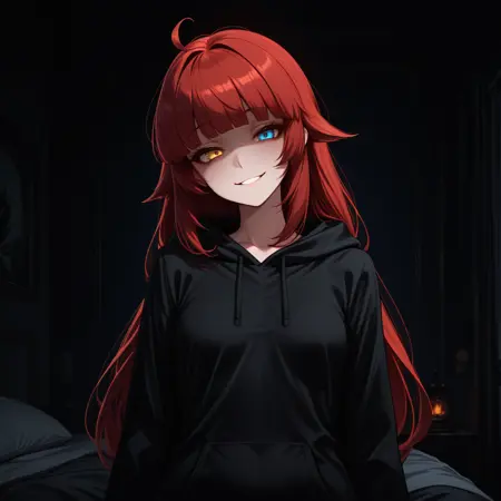 Character: long hair, red hair, ahoge, blunt bangs, black sclera, heterochromia, yellow eyes, blue eyes, small breasts