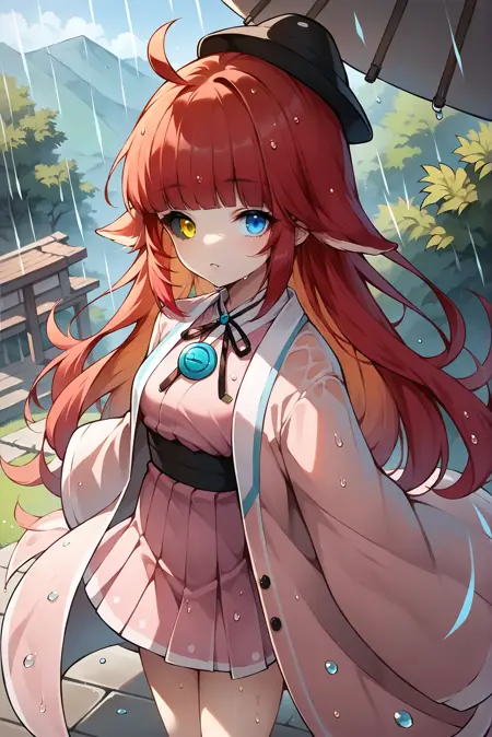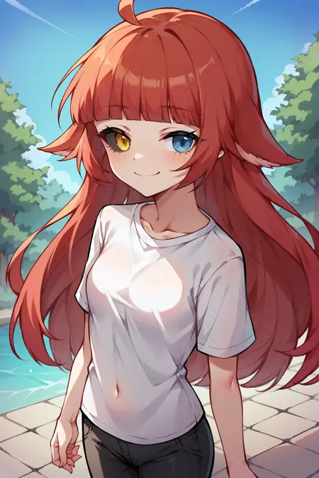 캐릭터: 낮게 묶인 긴 머리, 붉은 머리카락, 아호게, 둔한 앞머리, 이종 색채, 노란 눈, 파란 눈, 작은 가슴, 동물 귀, 처진 귀, 불일치하는 공막