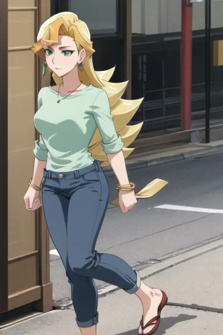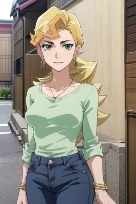YokoSakaki, 1girl, solo, long hair, blonde hair, green shirt, jewelry, medium breasts, green eyes, earrings, denim pants, necklace, bracelet, jeans,