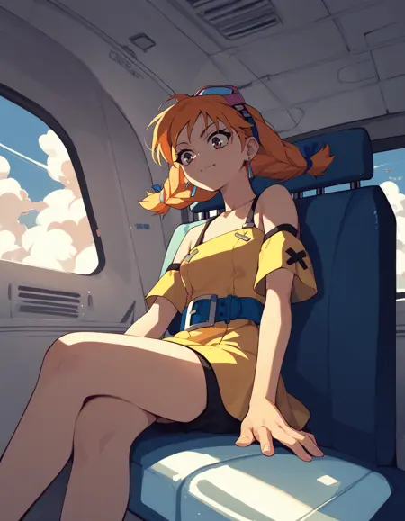 복장: 짧은 드레스, 노란 드레스, 파란 벨트, 짧은 반바지, 검은 반바지