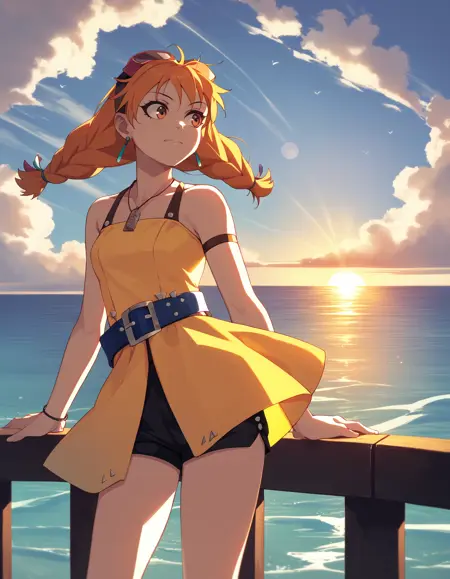 衣装: 短いドレス、黄色のドレス、青いベルト、ショートパンツ、ブラックショートパンツ