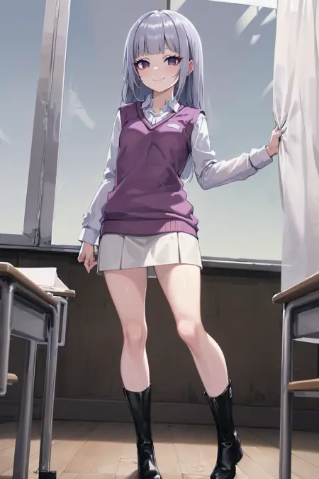 HolidayCasual: hcasual, collared shirt, white shirt, long sleeves, sweater vest, purple vest, miniskirt, white skirt, black footwear, boots