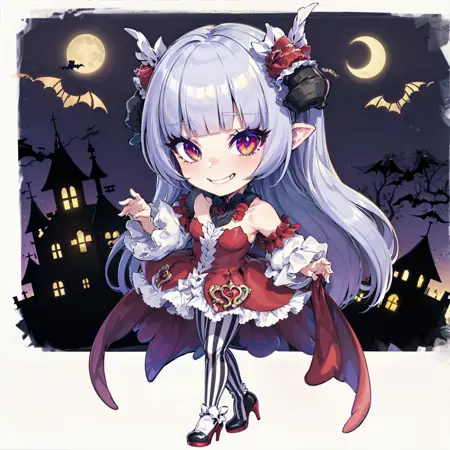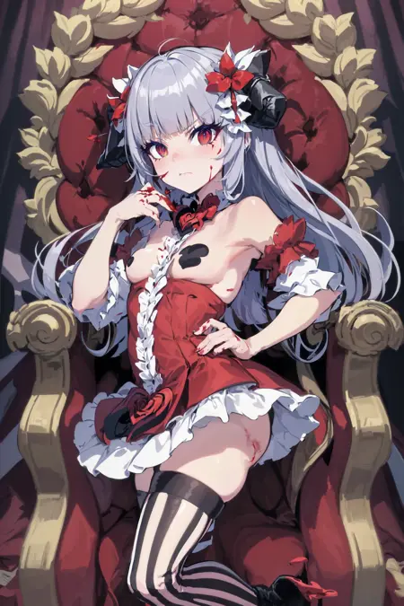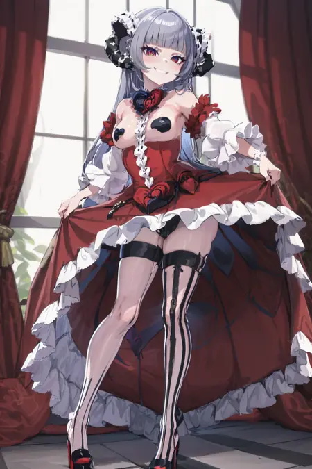 DiaboliqueOrigine: dorigin, hair ornament, hair bow, horns, heart brooch, red dress, frills, bare shoulders, detached sleeves, puffy sleeves, heart pasties, single thighhigh, vertical stripes, asymmetrical legwear, high heels
