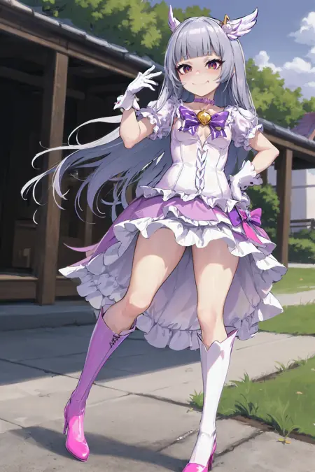 Magica2019: magica2019, wing hair ornament, choker, purple dress, bowtie, brooch, purple bow, short sleeves, frills, white gloves, knee boots, purple footwear. heels