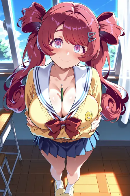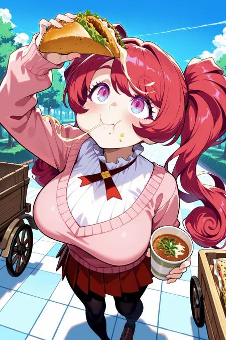 머리 고리, 빨간 머리, 매우 긴 머리, 다색 눈, 보라색 눈, 분홍색 눈, 파란색 눈,