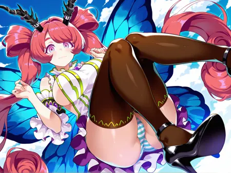 DiaboliqueOrigin: dorigin, 뿔, 흰 드레스, 프릴, 어깨 노출, 분리된 소매, 나비 날개, 갈색 허벅지 양말, 검은 신발, 하이힐, 측면 가슴, 줄무늬 속옷,