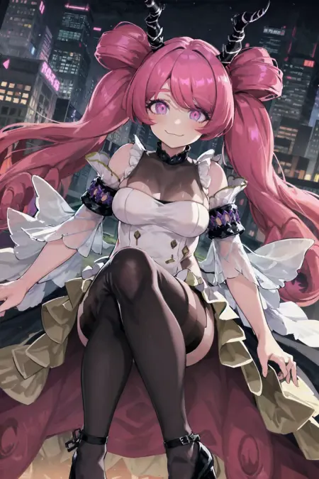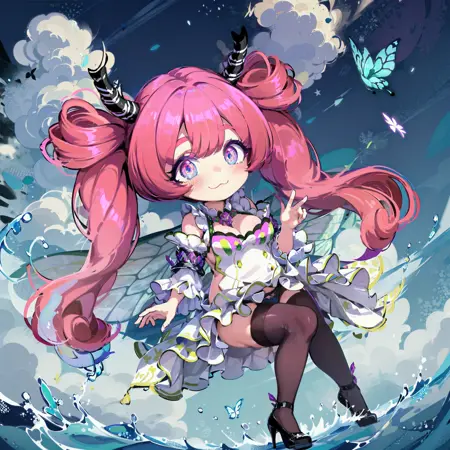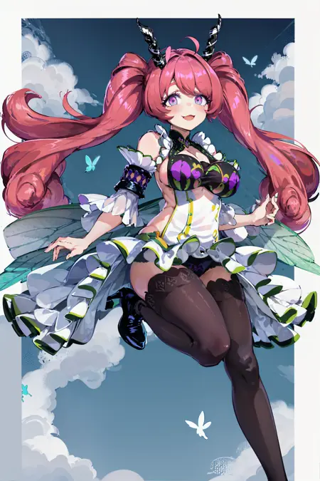 DiaboliqueOrigin: dorigin,角,白色连衣裙,荷叶边,露肩,脱落袖,蝴蝶翅膀,棕色过膝袜,黑色鞋履,高跟鞋,侧乳,条纹内裤,