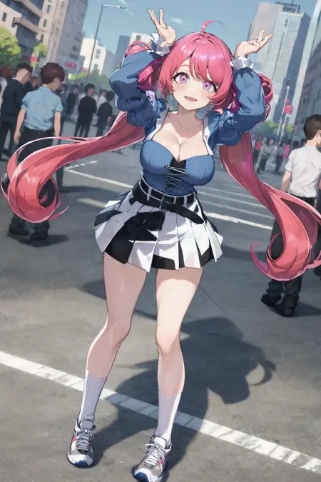 HolidayCasual: hcasual,蓝色衬衫,锁骨,乳沟,长袖,蓬松袖,腰带,白色裙子,松垮袜子,运动鞋