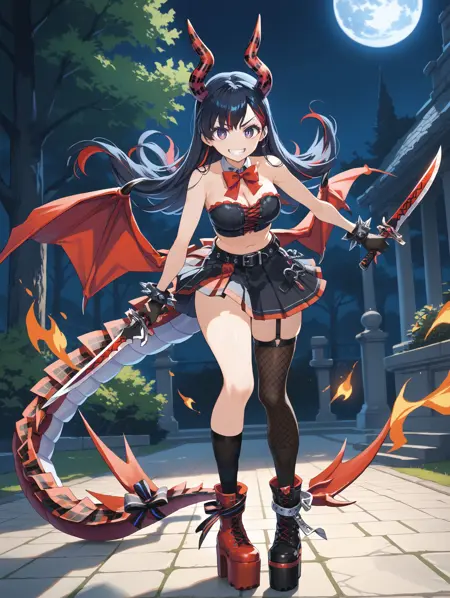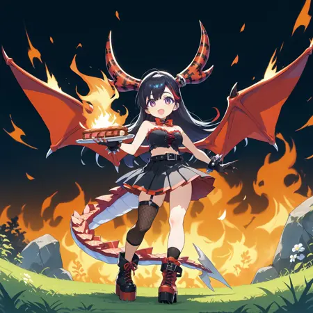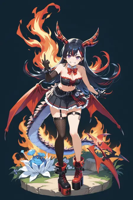 DiaboliqueOrigin: dorigin, 角,项圈,蝴蝶结,红蝴蝶结,黑色露肩上衣,裸露肩膀,乳沟,单肘手套,带刺手镯,黑色手套,指甲,红指甲,肚脐,腰带,黑色短裙,百褶裙,红色翅膀,蜥蜴尾巴,单侧大腿袜,吊袜带,渔网袜,不对称鞋履,厚底靴,红色鞋履,黑色鞋履
