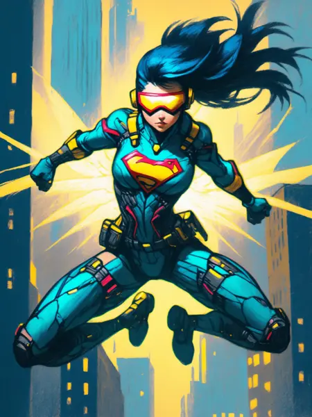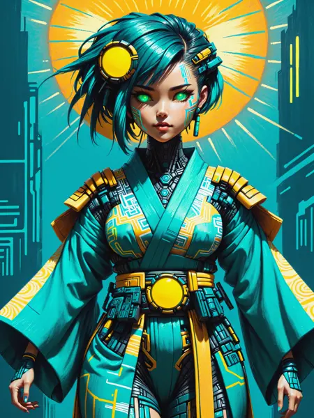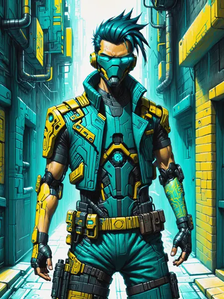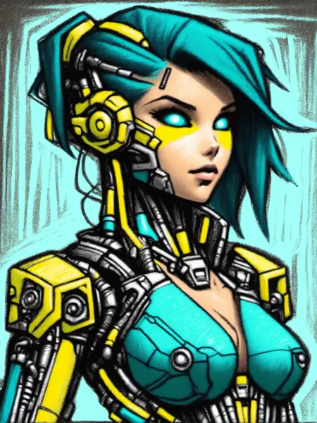 이번에는 사이버펑크 스타일의 연필 그림 LoRA를 준비했습니다. 이 LoRA는 노랑과 티얼 색조로 된 사이버펑크 테마의 이미지로 학습되었습니다. 따라서 이 스타일에 자연스럽게 치우쳐 있습니다.