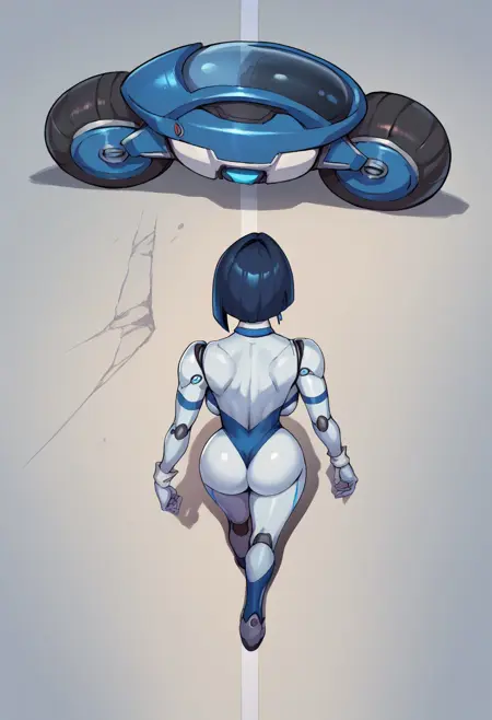 - 더 높은 정확도를 위해 다음 키워드를 추가하세요: 안드로이드, 로봇 관절, 분리된 칼라, 큰 가슴, 파란 머리, 단발, 파란 입술