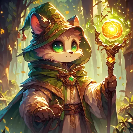 プロンプト:"score_9, score_8_up, score_7_up, score_6_up, score_5_up, score_4_up, (かわいい小さなパンダ、大きなかわいい目、(黄色の魔法の帽子:1.25)、黄色の魔法のorbstaffを所持:1.2)、背景に鮮やかな魔法の森、hkanimal"