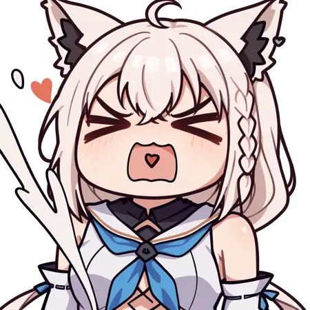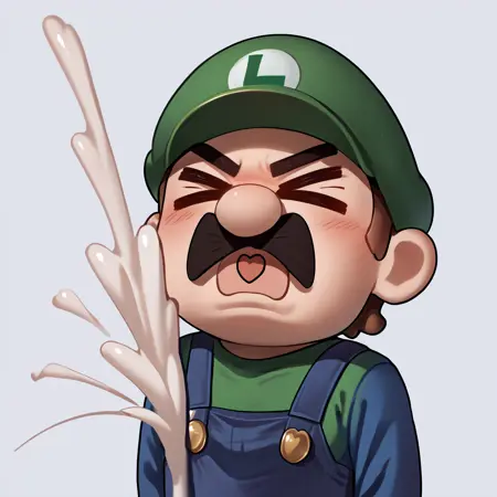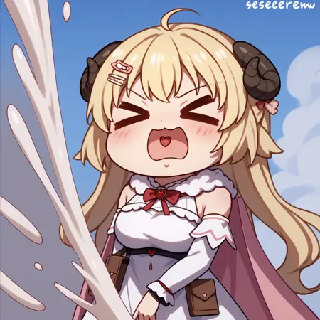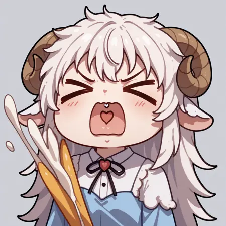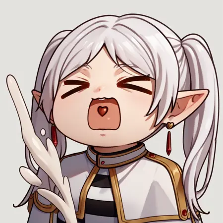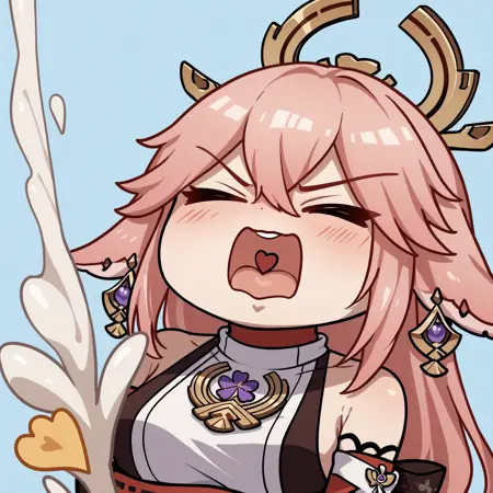 chibi, closed eyes, open mouth, > <, heart in mouth, cum, upper body