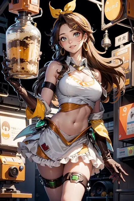 Celica Bubble Tea, 1girl, solo, long hair, brown hair, hair ornament, hairclip, bangs, hair bow, looking at viewer, green eyes, earrings, hoop earrings, smile, jewelry, dress, white dress, sleeveless, crop top, bow, breasts, large breastst, cleavage, gloves, brown gloves, navel, skirt, white skirt, thighhighs, thigh strap, boots, alternate costume, food, cup, drinking straw, bubble tea, robot, mecha