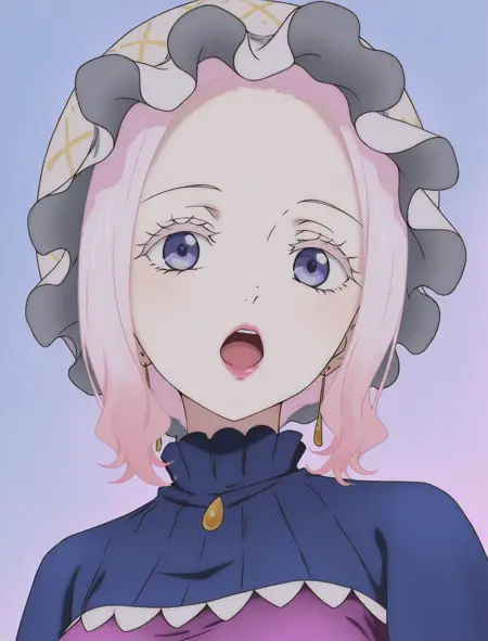 purple dress, blue cape, hat, earrings
