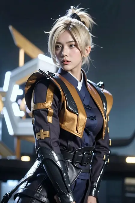 kagutsuchi valhein, solo, 1boy, blonde hair, bangs, hair between eyes, ponytail, spiked hair, looking at viewer, male focus, blue eyes, closed mouth, long sleeves, alternate costume, kimono, japanese clothes, armor, shoulder armor, wrist guards, coat, blue coat, belt, pants, black pants, boots, black footwear, floating, floating object, glowing