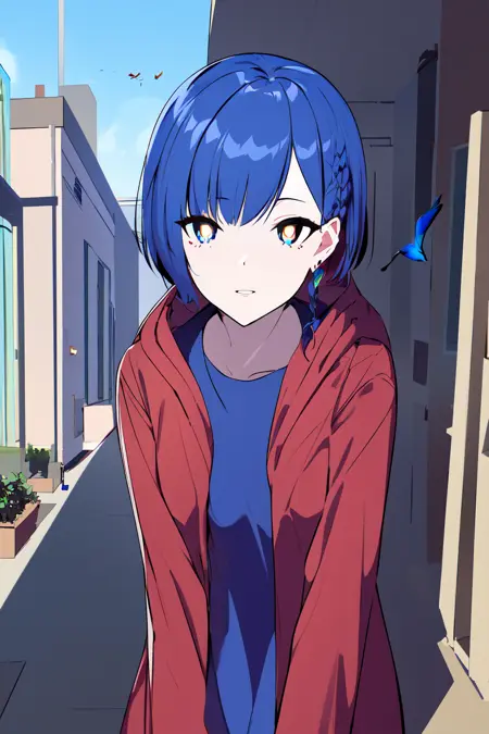 提示词: rim,彩色眼睛,黄色瞳孔,饰品,耳环,夹克,(蓝色头发:1.3),辫子,内层彩色头发,红色内层头发,敞开夹克,衬衫,短发,敞开的服装,连帽,长袖,红色夹克,蓝色衬衫,刘海,微张的嘴唇,连帽夹克,黄色眼睛,渐变眼睛,蓝色眼睛