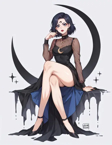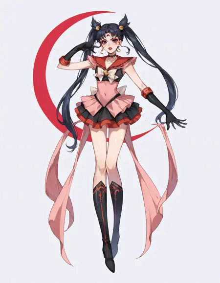 long legs, crescent, crescent facial mark, makeup, lipstick, mascara, eyeshadow, magical girl - 我希望邪恶水手战士的模样……但你也可以自行调整。