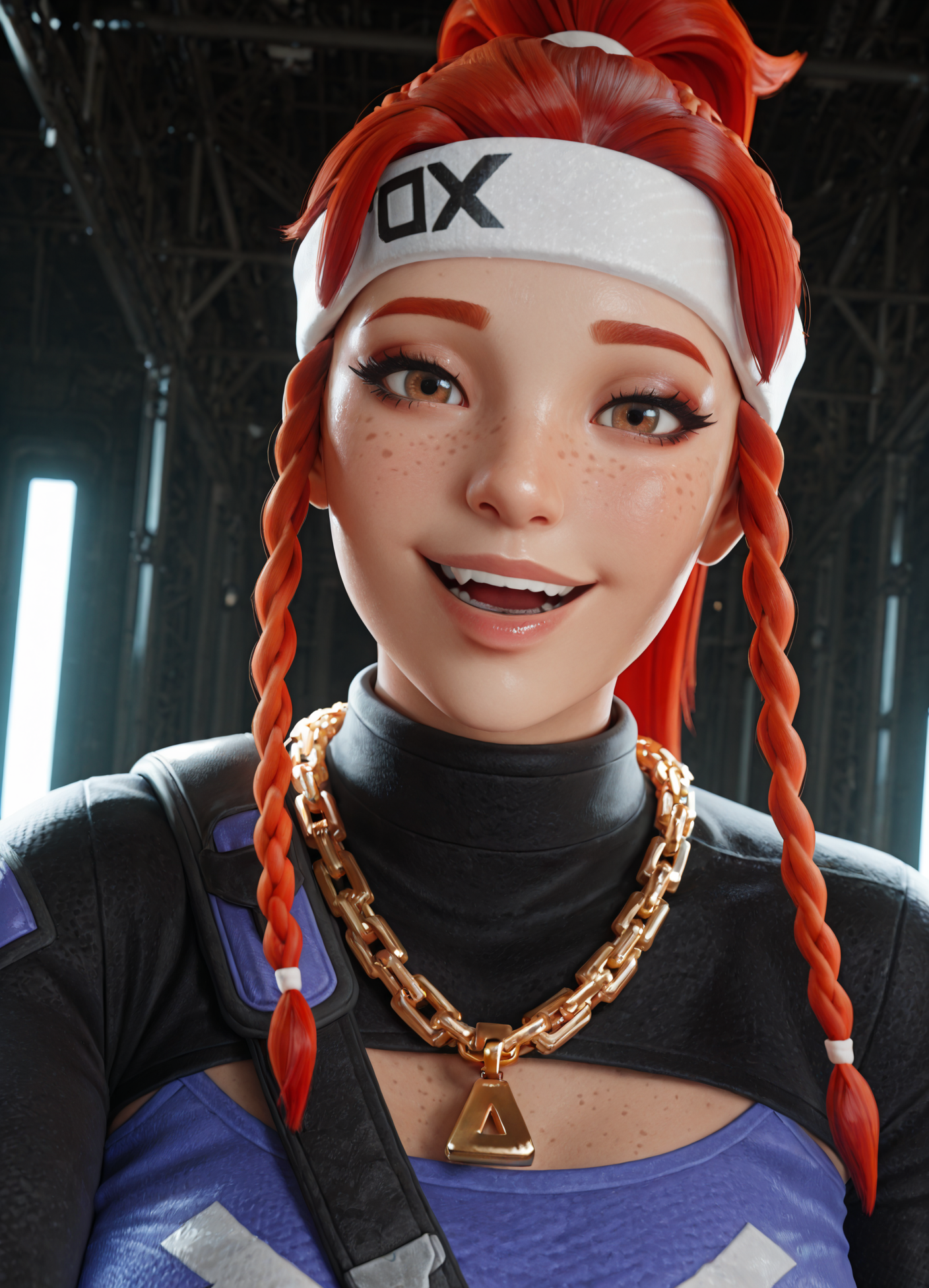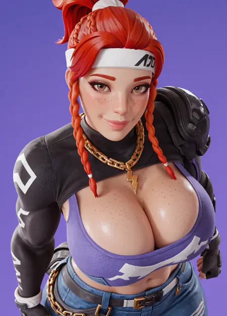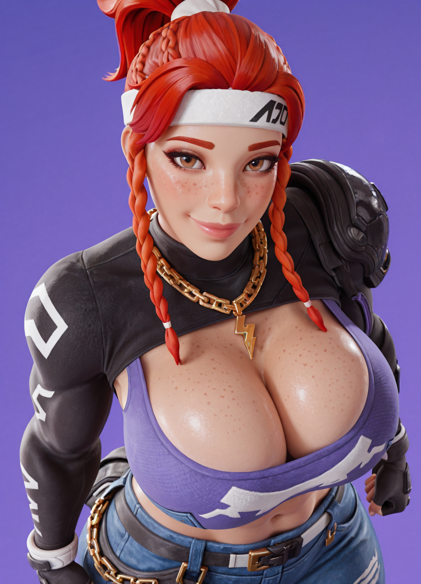 そばかす、(紫のショートトップ)、白いショートトップ、黒い袖、ジュエリー、ツインブレイド、赤髪、ネックレス、ブレイド、手袋、ヘッドバンド、服装のカットアウト、デニム、お腹の部分、白いヘッドバンド、青いパンツ、指なし手袋、ベルト、胸元のカットアウト、茶色の目、チェーン、ショートシャツ、へそ、雷の形をしたネックレス