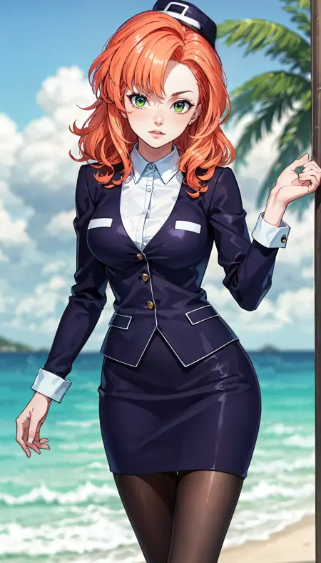 long hair, red hair, green eyes, blue uniform, blue hat, collared shirt, blue skirt, pantyhose