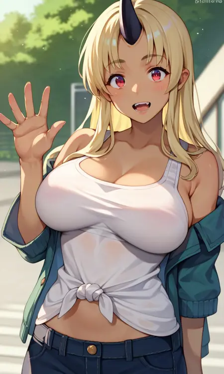 프롬프트: tionishia, 빨간 눈, 금발, 뿔, 검은 피부의 여자