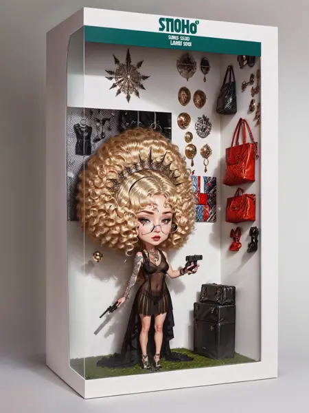 这个模型非常的好玩,可以把你的人物塞入一个包装盒里面,如果你组合使用其他模型就会出现玩具的效果。塞入包装盒的除了人物,还有和他相关风格的装饰,衣服等,你可以自己输入关键词来添加,虽然不能精准到每一个物品,但是也基本上八九不离十了。
