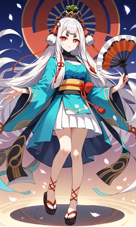Chin_onmyoji, very long hair, white hair, bang, hikimayu, pink eyes, hair ornament, japanese clothes, turquoise sleeves, wide sleeves, white skirt, very short skirt, obi, red ribbons, geta sandals