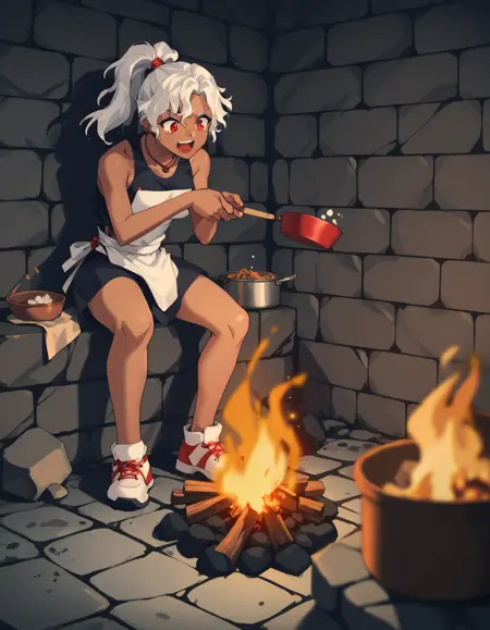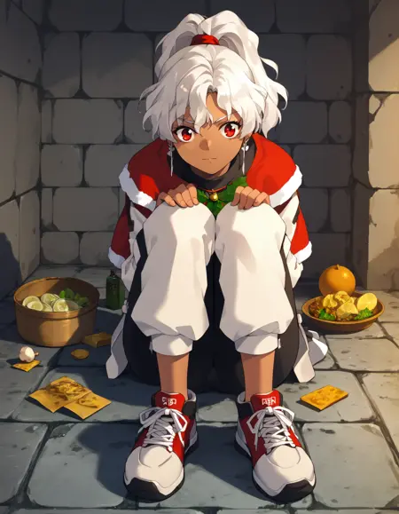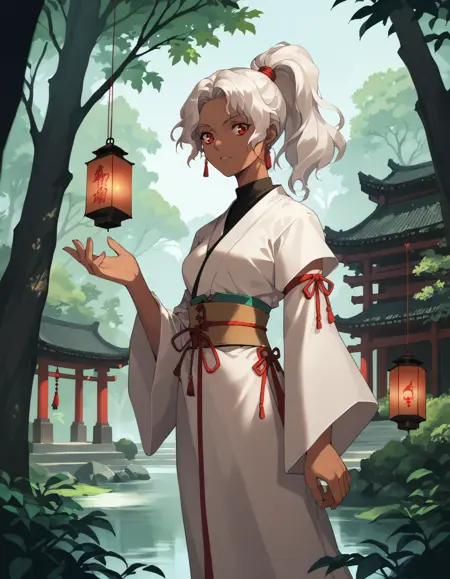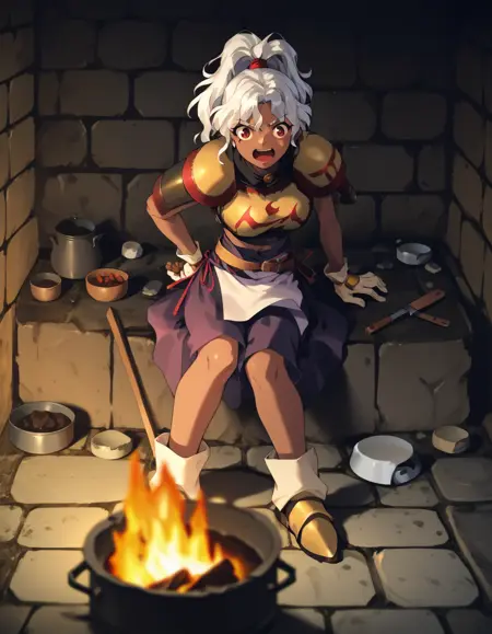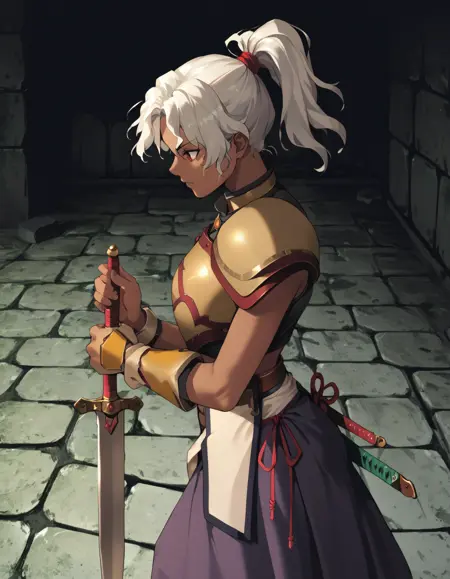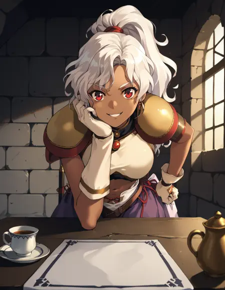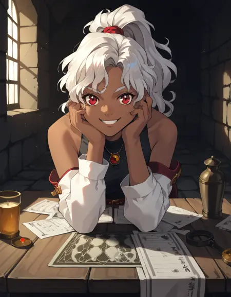 trigger: wwrita, red eyes, white hair, ponytail, dark-skinned female