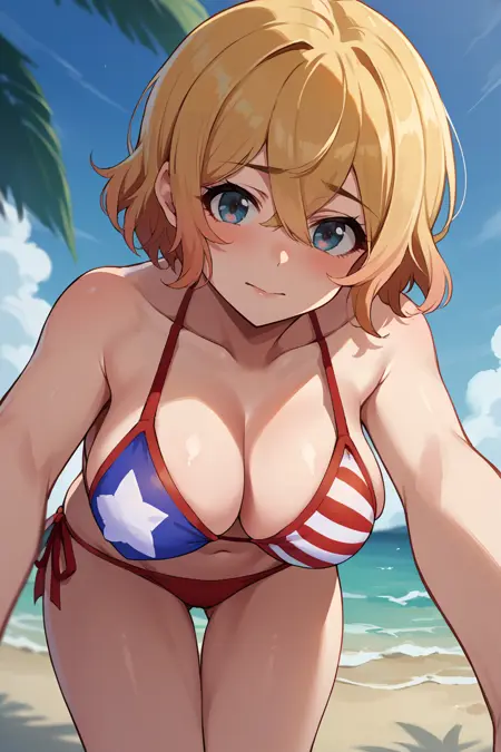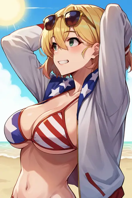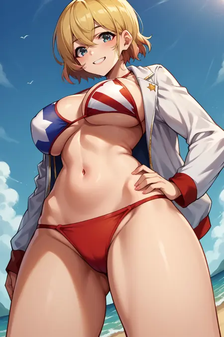 Add "american flag bikini, white jacket, red bikini bottom" for her bikini.
