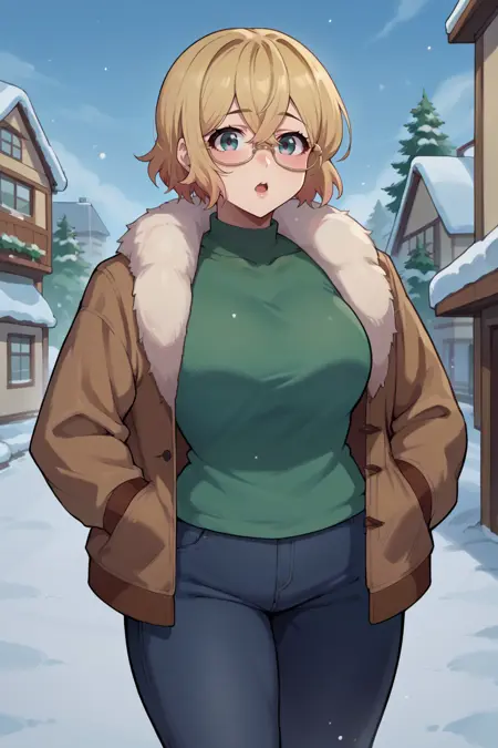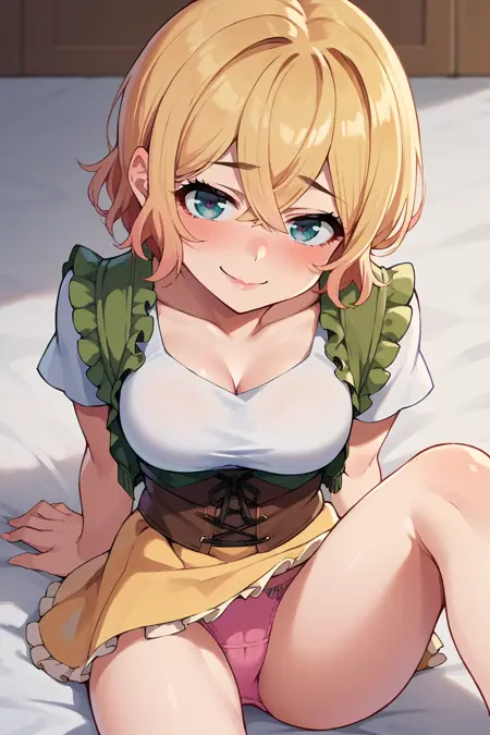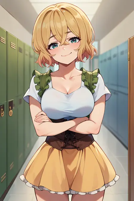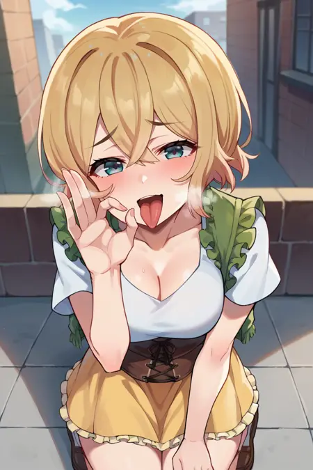 Add "white t-shirt, green vest, frills, short sleeves, corset, yellow skirt, cleavage" for her vest.