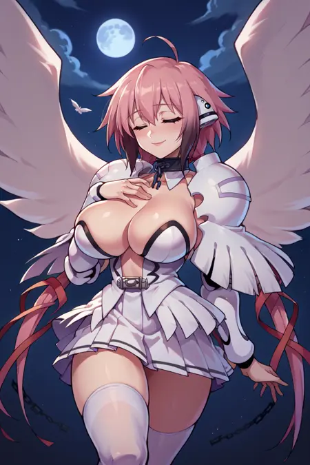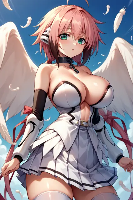 Add "white wings, choker, chain, bare shoulders, white dress, cleavage, pleated skirt, bracers, thighhighs" for her typical look.
