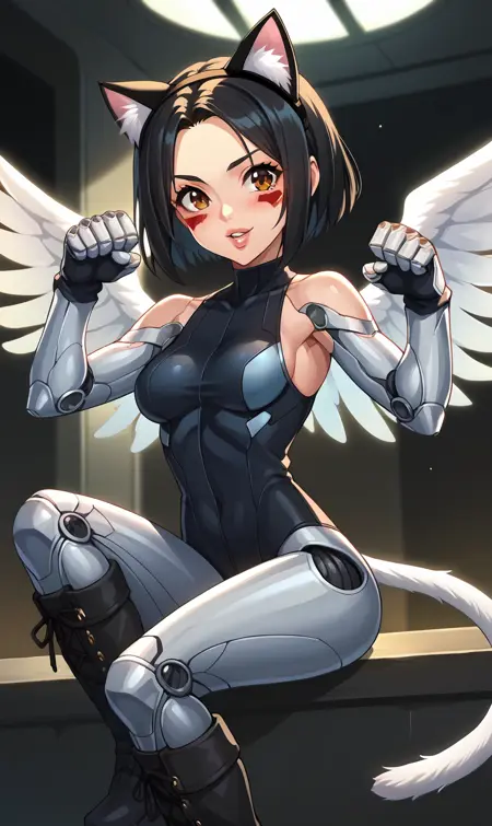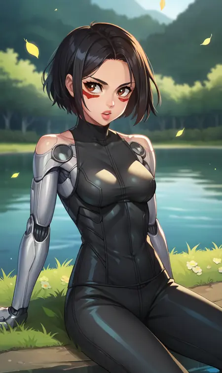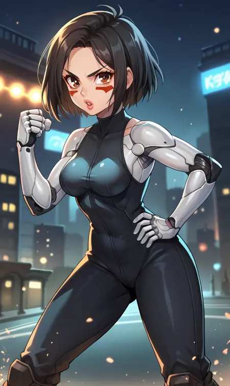 gallyxl,短发,黑发,棕眼,嘴唇,面部彩绘,面部标记,紧身连体衣,露肩,裤子,机械臂,仿生人,赛博朋克,科幻