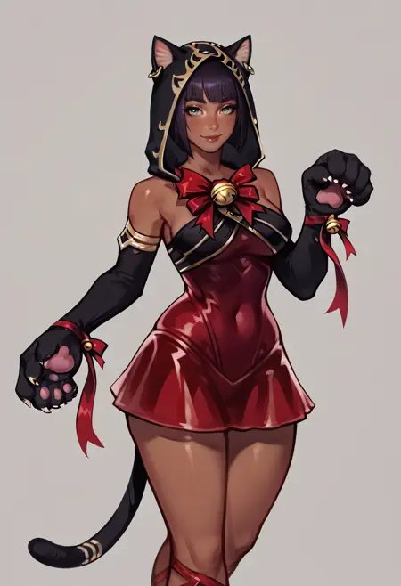 - Outfit Descriptors: short hair, bob cut, cat hood, bell bow, red dress, bare shoulders, paw gloves, tail, gladiator sandals