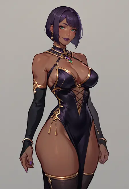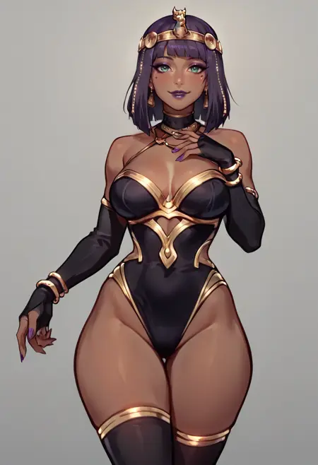 - Outfit Descriptors: naked bandages, medium hair, purple lipstick, egyptian tiara, legwear, fingerless gloves