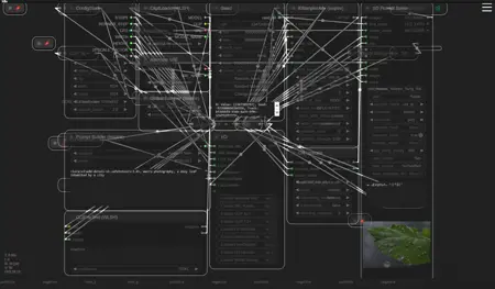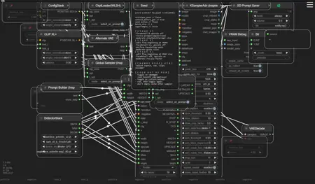 詳細なオプションと接続は下層に配置されています。このワークフローは、小さな解像度の画面に収まるように、芸術的かつ整理された構成を目指して作成しました。意図は、誤ったクリックを減らし、古いプロセッサでは反応が遅い画面のナビゲーション時間を節約することです。
