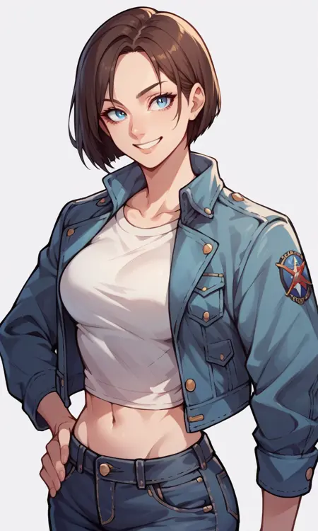 “JillRE3,棕色头发,波波头,短发,背带裤,铅笔裙,衣物围绕腰部,长靴,紧身背心”用于她的RE3默认服装。