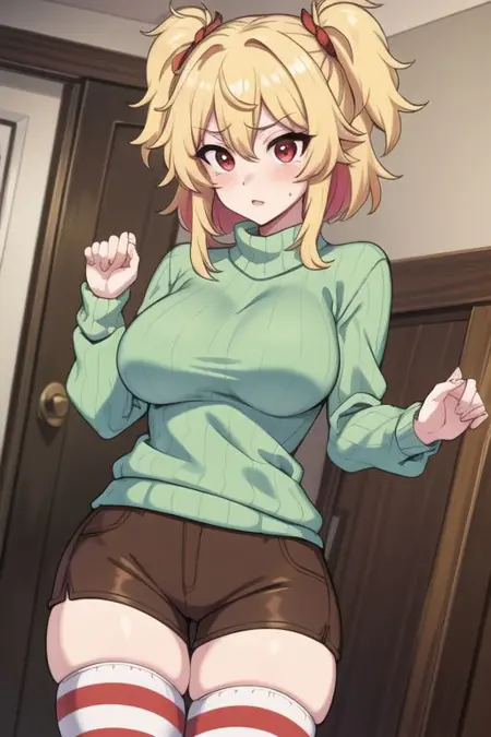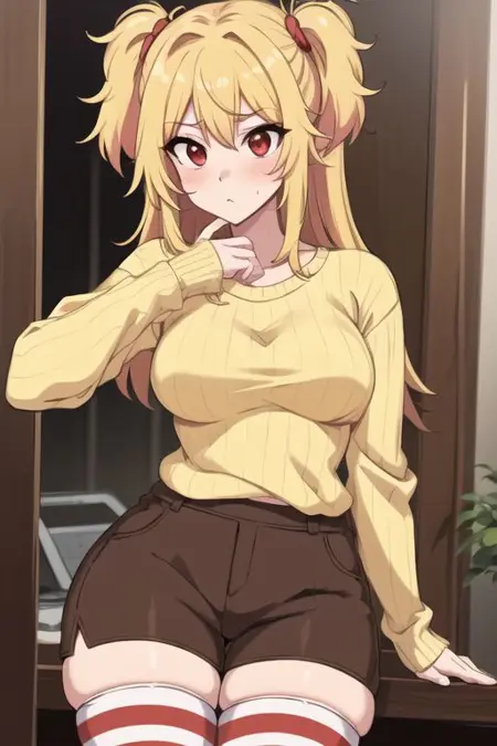 Miocrushcrush, 1girl, solo, blonde hair, yellow crop top, multicolored hair, short shorts, striped thighhighs, large breasts, red eyes, striped fingerless gloves, striped sleeves,