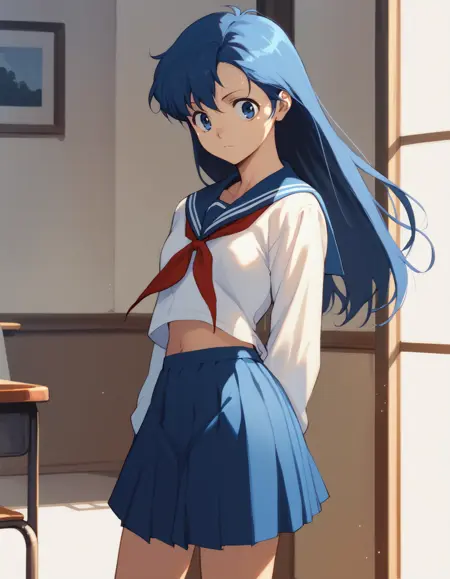 학교 유니폼: asou yuuko, 긴 머리, 세라푸크, 학교 유니폼, 긴 소매, 흰색 셔츠, 파란 스커트