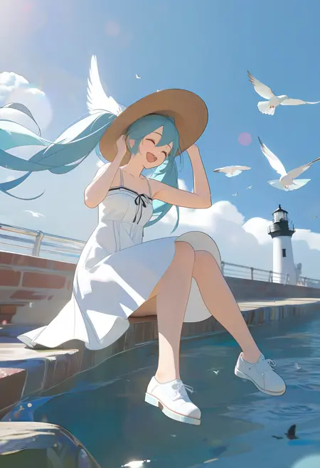 (by ningen mame:0.8), (by ciloranko:1.1), (by sho (sho lwlw):1.2), 1girl, 1 hatsune miku, sitting, arm support, smile, detailed, amazing quality