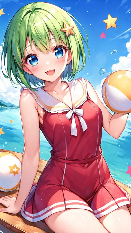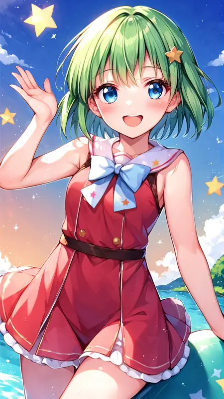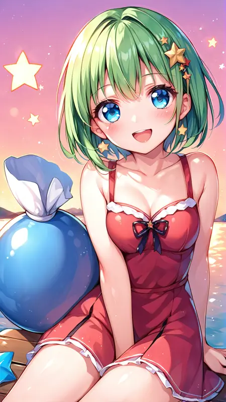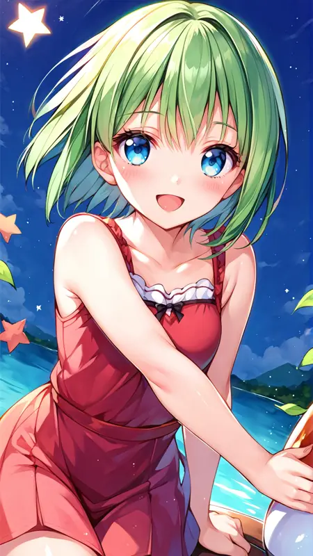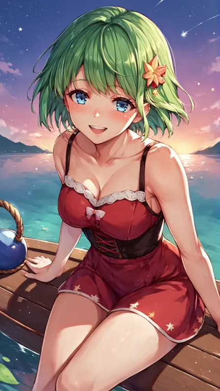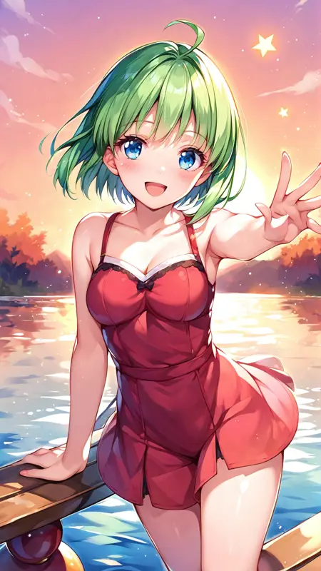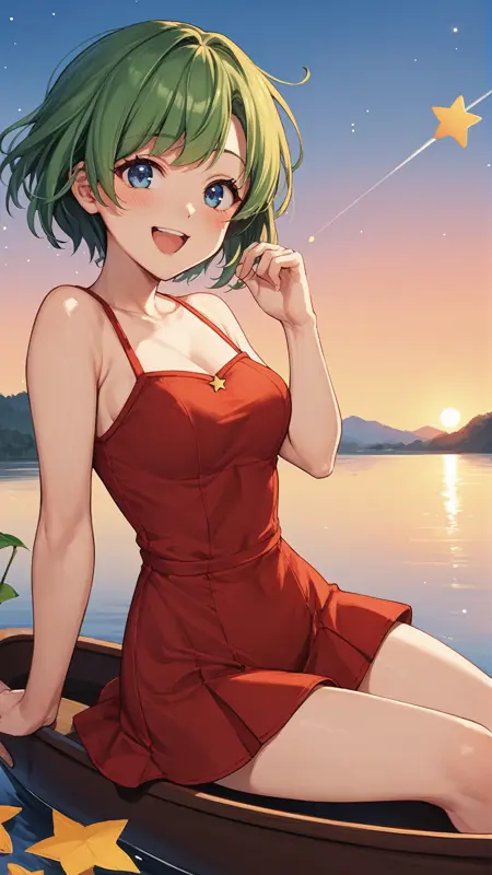 クレム, kuremu, green hair, short hair, blue eyes, red short dress, red short boots, in dusk, in sunset, sitting on Gourd-type boat, in lake, star-type leaf, falling star-type leaf,