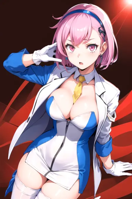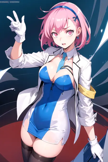 MeguruDaimon, 1girl, solo, short hair, large breasts, hair ornament, thighhighs, white gloves, short dress, cleavage, jewelry, white jacket, pink hair, blue hairband, earrings, open jacket, necktie, pink eyes