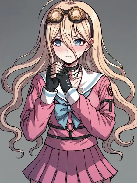 衣装: 学校制服、セーラー服、青いリボン、ピンクのシャツ、ピンクのスカート、Oリング、レザー straps、