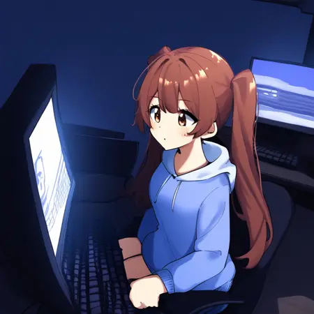 론리카 본인: 1girl, ronika, auburn-brown hair, very long hair, twintails, sidelocks, auburn-brown eyes, medium-sized chest,
